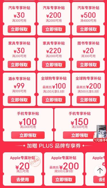 京东 PLUS超级补贴 领满500-50、满1500-150、满3000-300、满5000-500元新增新增800-80元补贴券 1500-100/1000-100元手机专享券 PLUS苹果专享券等