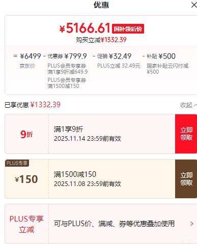 商品到手价5166.61元(需领券),根据小编提供的优惠信息(满1500减150+满1元,打9折+3C-政府补贴15%/20%--部分地区可领),下单1件。好价不错过,感兴趣的朋友可以试试!