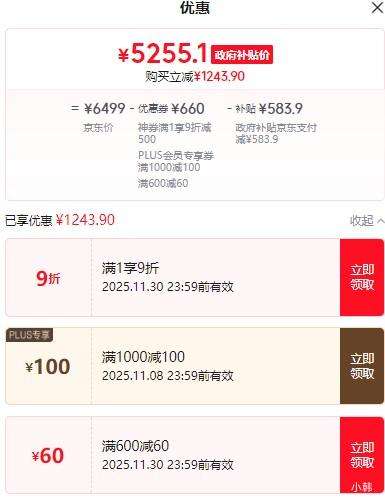 商品到手价5255.1元(需领券),根据小编提供的优惠信息(满600减60+满1元,打9折+3C-政府补贴15%/20%--部分地区可领),下单1件。好价不错过,感兴趣的朋友可以试试!