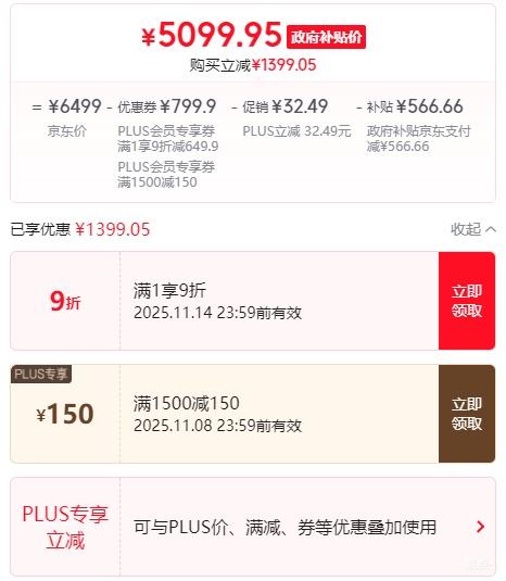 商品到手价5099.95元,根据小编提供的优惠信息(京东 plus 双11 1111元超级补贴 (500-50/1111-111/1500-150/3000-300/5000-500元)+plus超级补贴 限时加码9折券 至高抵(150/500 )),下单1件。好价不错过,感兴趣的朋友可以试试!