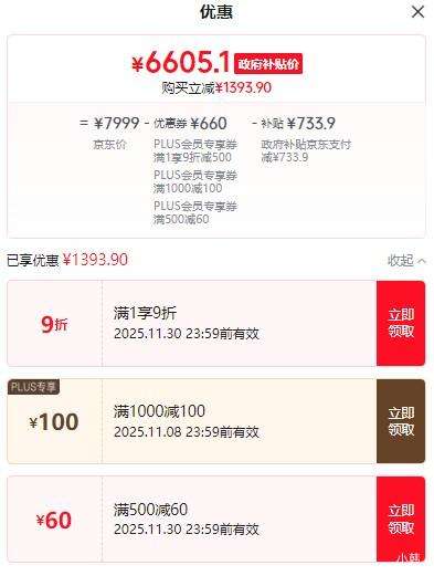 商品到手价6605.1元(需领券),下单1件。好价不错过,感兴趣的朋友可以试试!