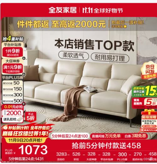 京东自营20点、再降价、PLUS:全友家居 科技布艺沙发客厅小户型现代简约直排式一字沙发家用