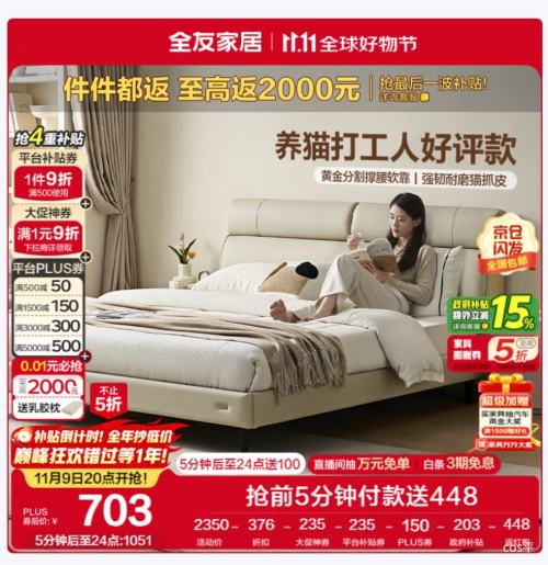 京东自营9日20点、PLUS:全友家居 现代简约皮艺床主卧室床头软包靠背双人大床1.8x2米国家补贴