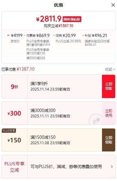 商品到手价2811.9元(需领券),根据小编提供的优惠信息(满1500减150+满1元,打9折+直播间领券300+3C-政府补贴15%/20%--部分地区可领),下单1件。好价不错过,感兴趣的朋友可以试试!
