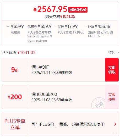 商品到手价2567.95元(需领券),根据小编提供的优惠信息(满1元,打9折+3C-政府补贴15%/20%--部分地区可领),下单1件。好价不错过,感兴趣的朋友可以试试!