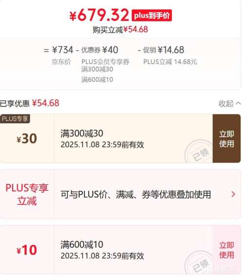 商品到手价679.32元(需领券),根据小编提供的优惠信息(满600减10+plus 限时加码好券 超市专享补贴 300-30),下单1件。好价不错过,感兴趣的朋友可以试试!